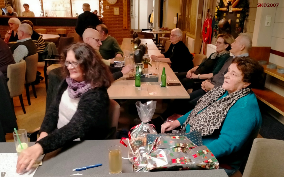Na een korte afronding van de kegelwedstrijd door Erik-Paul kwam de loterij in handen van André en Gerard. Graaiende handen in de trommel zochten naar overeenkomstige nummers in kleur op tafel. André deed zijn best om iedereen tevreden te stellen en Gerard ging steeds naar de kerstboom op zoek naar een volgend cadeau.