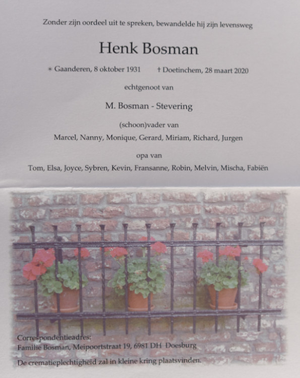 Op zaterdagochtend 28 maart 2020 is Henk Bosman overleden.